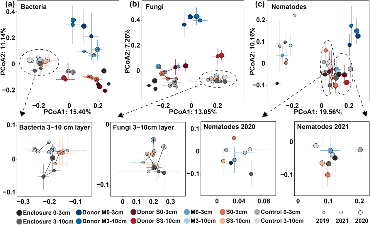 中国科学院沈阳应用生态研究所土壤健康维持机制与生物调控途径创新组群针对这一问题,在退化生态系统开展了为期三年的野外控制实验,系统追踪了土壤接种对接种层及深层土壤中细菌、真菌和线虫群落的动态影响。研究发现,土壤接种虽改变了退化草原的生物群落组成,但其效应主要局限于接种层的供体土壤中。而在接种层下方的土壤中,真菌和线虫群落呈现出向供体群落特征逐步趋同的演化趋势。