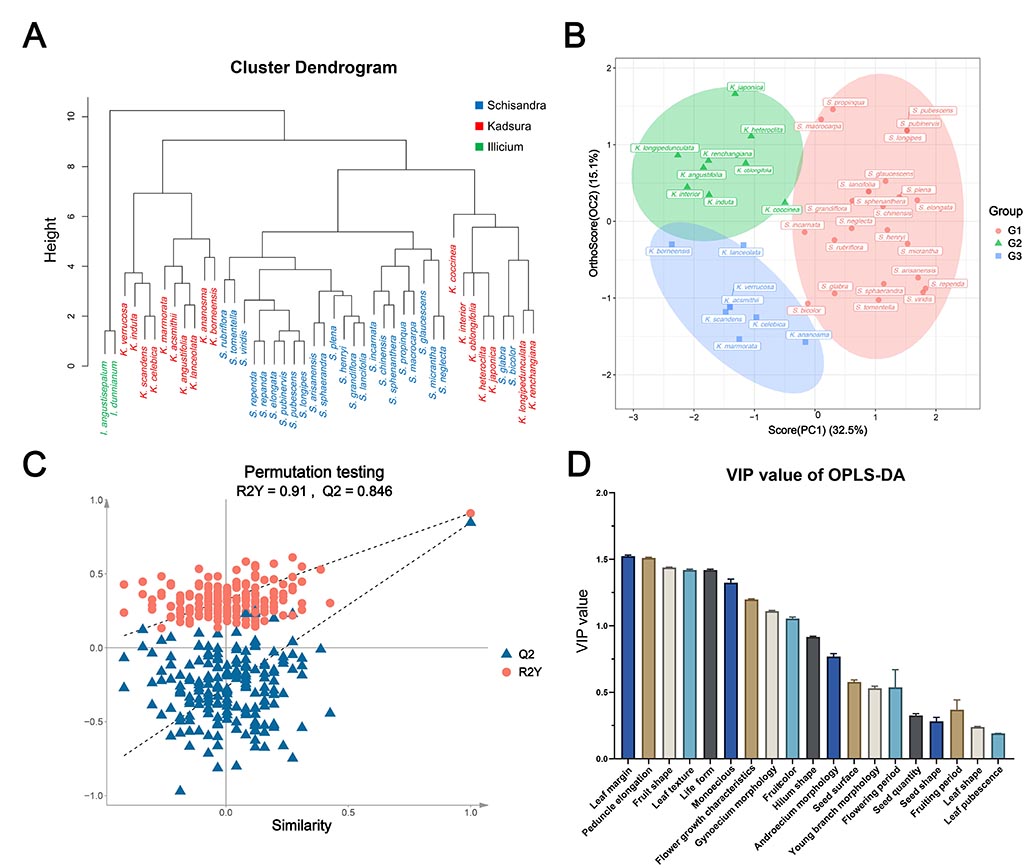 图2. 基于潜在结构的正交偏最小二乘判别分析(OPLS-DA)模型在南五味子属与五味子属多性状聚类中的应用。(A)基于20个形态性状戈氏距离构建的非加权组平均法(UPGMA)聚类树状图,展示南五味子属与五味子属类群间的表型亲缘关系;(B)基于形态性状的正交偏最小二乘判别分析将41个物种清晰聚为3个类群,分别标记为G1、G2和G3;(C)正交偏最小二乘判别分析置换检验图,其中R²和Q²分别代表模型的解释度与预测能力,可用于判别模型优劣;(D)投影重要性指标(VIP)图,用于综合评价各变量的贡献度,该图按指标值从大到小排序,数值较大的变量展示于图左侧。