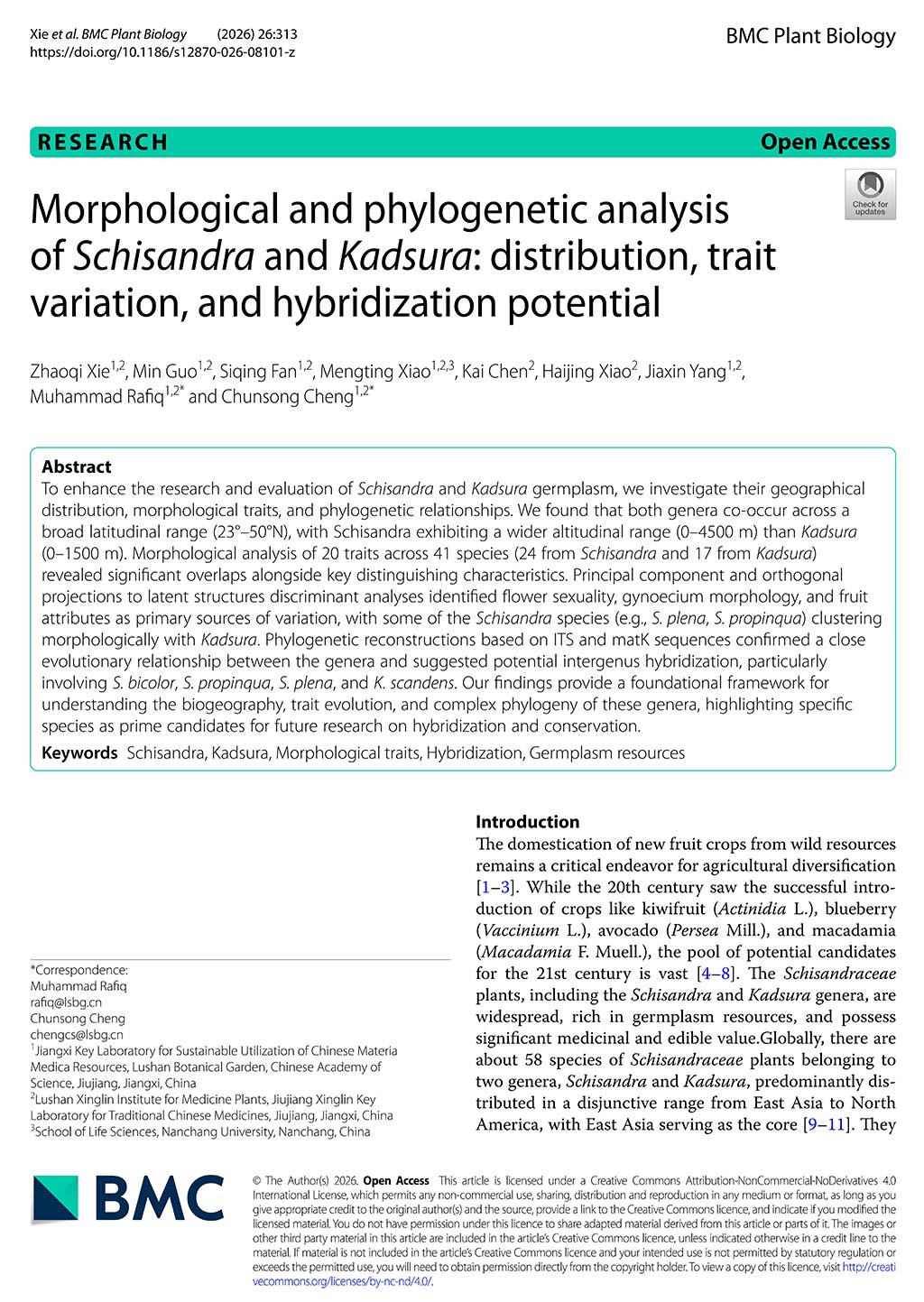 2026年1月21日,江西省、中国科学院庐山植物园程春松、谢钊启团队在国际学术期刊《BMC Plant Biology》(中科院二区TOP,5-yr IF: 5.4)上发表了题为“Morphological and phylogenetic analysis of Schisandra and Kadsura: distribution, trait variation, and hybridization potential”的研究论文。该研究系统解析了两属植物的地理分布规律、形态特征分化机制及种间杂交潜力,厘清了其进化亲缘关系,并创新性提出跨属历史杂交假说,为五味子科植物的种质资源精准鉴定、优质品种分子育种及野生资源保护利用提供了关键的理论支撑与技术参考。