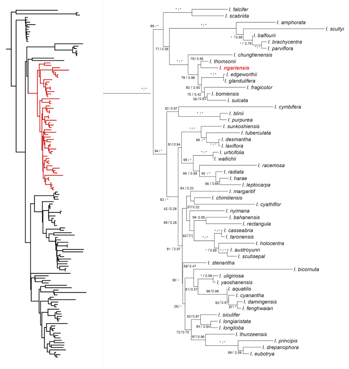 图2 基于nrITS与atpB-rbcL片段联合构建的凤仙花属系统发育树