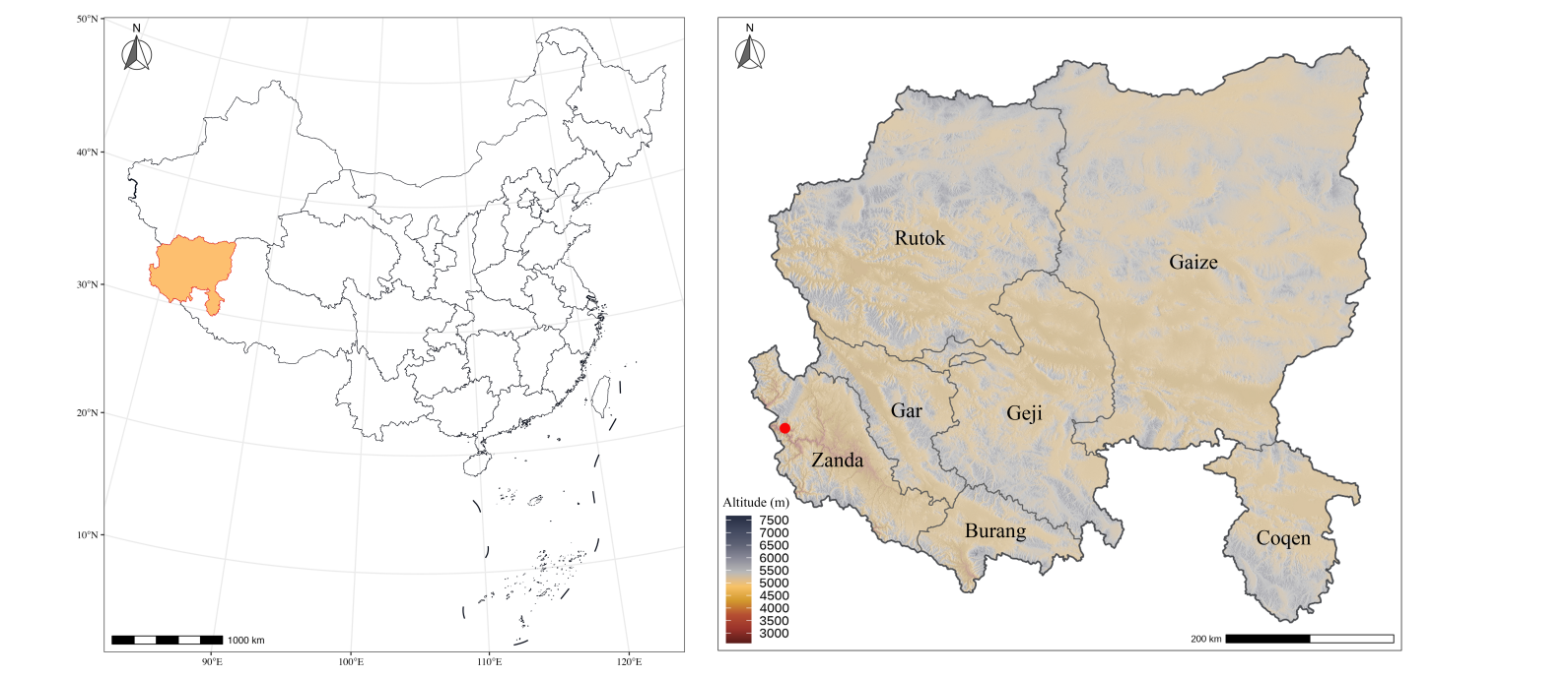 图4 阿里凤仙花在阿里地区扎达县的地理分布(红点)