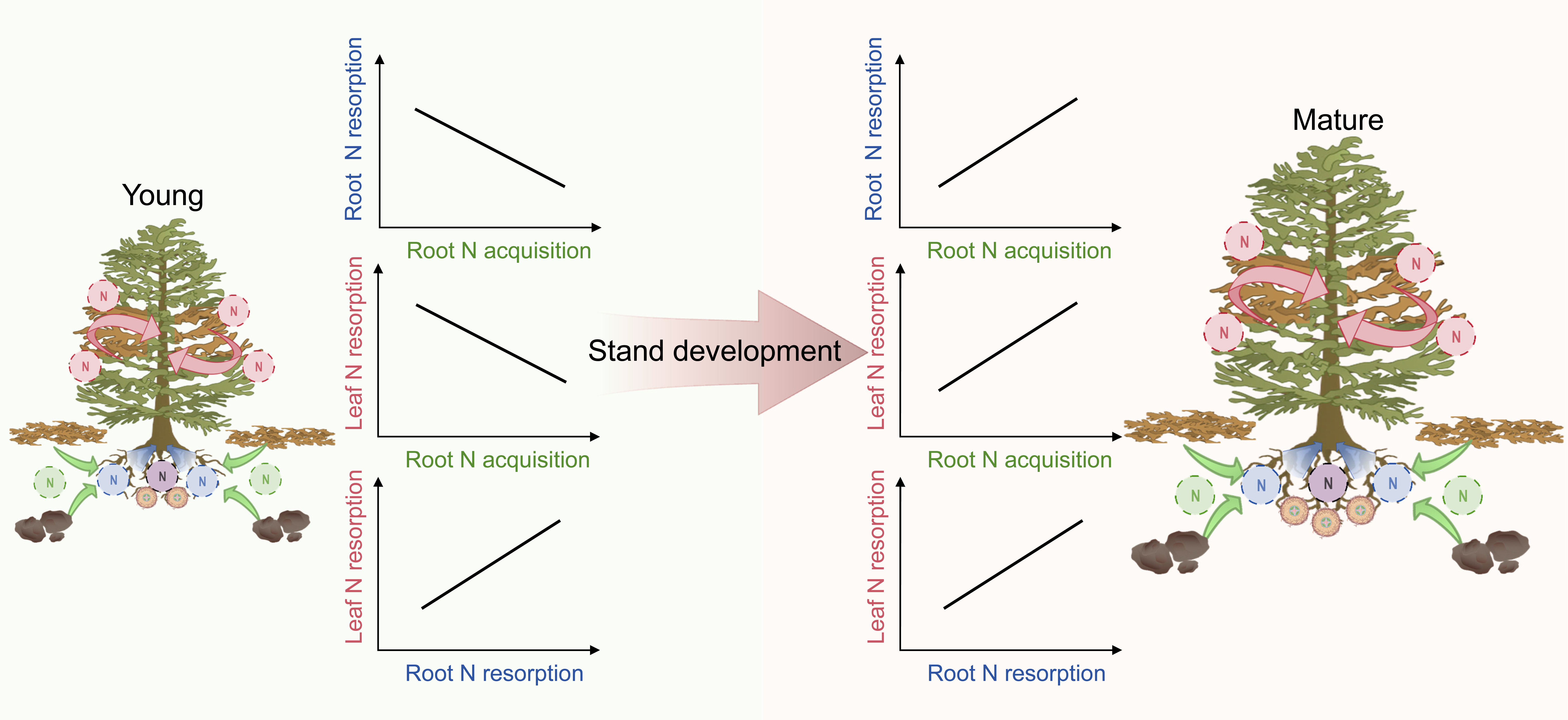 针对这一科学问题,研究团队提出“树木氮经济三元框架”(triadicnitrogen economy),将根系氮获取、叶片氮重吸收、根系氮重吸收三条路径纳入统一核算(图1),并依托位于北半球最大的人工林种植基地(塞罕坝机械林场)的“河北塞罕坝人工林生态系统国家野外科学观测研究站”的不同林龄(幼龄林、中龄林和成熟林)华北落叶松(Larix principis-rupprechtii)人工林长期(已15年)氮添加控制实验开展验证。研究发现三条路径之间的耦合关系会随林分发育发生方向性转变:在氮限制相对较弱的幼龄林,树木生长的氮利用策略表现为:根系氮获取与叶片氮重吸收、根系氮重吸收均呈权衡关系,而叶片氮重吸收与根系氮重吸收则呈协同关系。随着林分发育,成熟林表现为更强的氮限制,且根系氮获取的碳消耗成本更高,促使树木生长的氮需求由根系的“自主式”获取逐步转向与外生菌根真菌协作的“外包式”获取,并更依赖体内氮的重吸收。其氮利用策略表现为:根系氮获取与叶片氮重吸收、根系氮重吸收关系均由权衡转为协同。同样,叶片氮重吸收与根系氮重吸收呈协同关系(图2)。