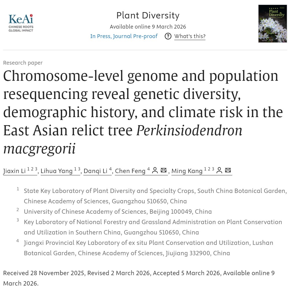 近日,华南植物园(康明研究团队)与庐山植物园(冯晨研究团队)合作,成功组装了银钟花的染色体水平参考基因组,并通过对全国30个种群167个个体的重测序分析,系统揭示了该物种的遗传多样性格局、种群历史动态及未来气候变化下的生存风险。相关成果“Chromosome-level genome and population resequencing reveal genetic diversity, demographic history, and climate risk in the East Asian relict treePerkinsiodendron macgregorii”发表于国际知名学术期刊《Plant Diversity》。DOI:https://doi.org/10.1016/j.pld.2026.03.001
