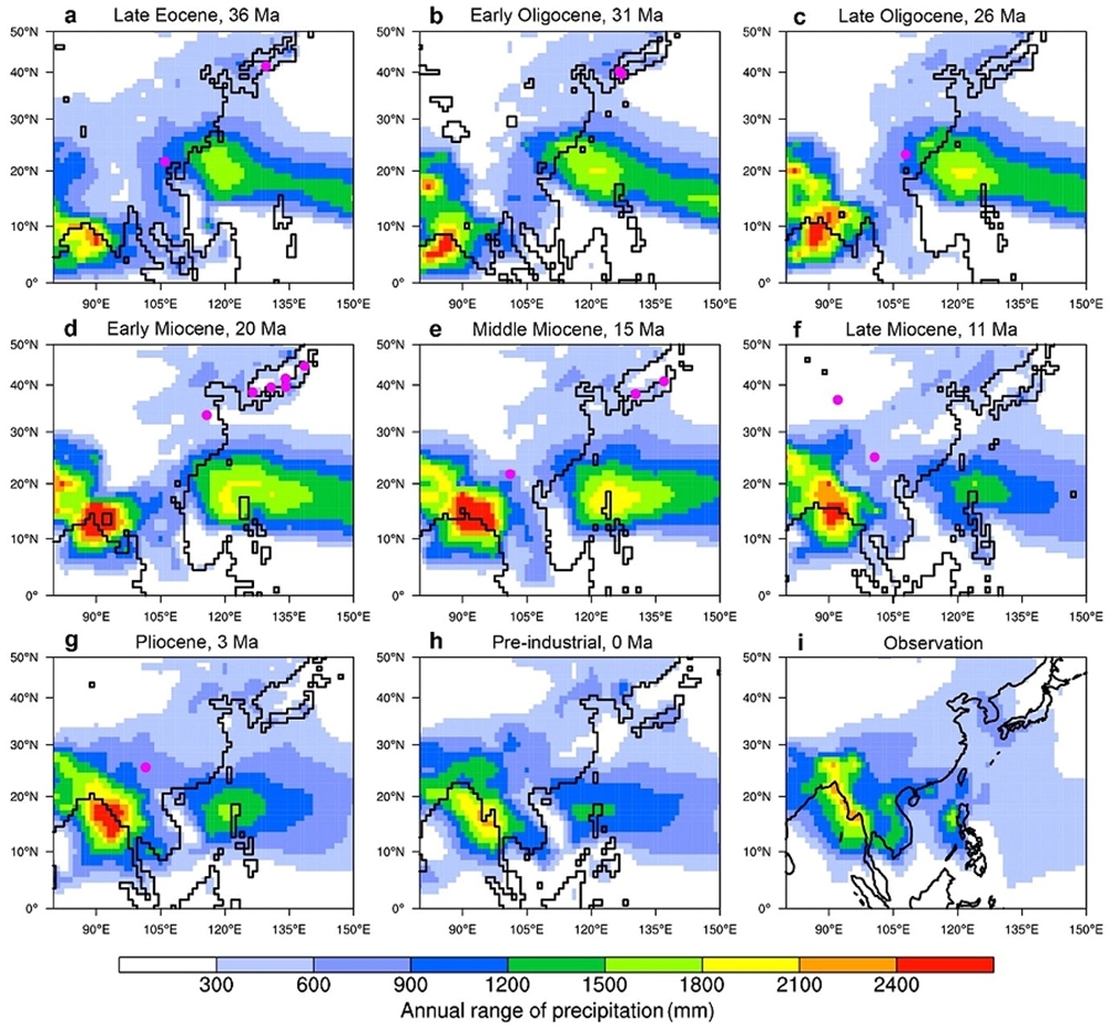 研究团队利用HadCM3B海气耦合气候模型进行了古气候模拟。结果表明,晚始新世的亚洲季风较今天弱且空间分布更弥散,但季节性降雨模式已经形成。越南北部的降水季节性很可能受热带辐合带(ITCZ)南北迁移控制,这使得该地区呈现出类似季风的气候特征。通过整合亚洲各地化石记录发现,从晚始新世到上新世,环孔材化石的时空分布与亚洲季风系统演化所驱动的季节性降水范围扩张高度吻合。东亚被子植物落叶性及其关键适应性状——环孔材的演化,很可能与古近纪—新近纪期间该区域降水季节性的增强密切相关。该结果为理解亚洲季风演化与植物适应性进化之间的协同关系提供了关键古生物学证据。