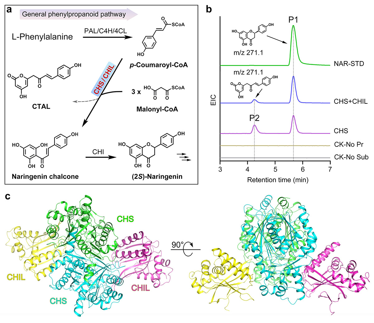 a-b:IV型查尔酮异构酶(chalcone isomerase-like protein,CHIL)可以调控查尔酮合酶(Chalcone synthase, CHS)的催化效率与产物特异性;c:CHS-CHIL复合体的晶体结构。