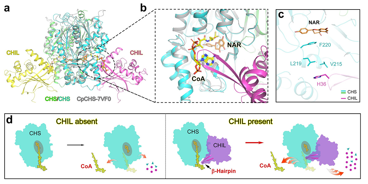 在没有CHIL结合时,CHS的催化效率较低,且因产物CoA释放缓慢而产生更多副产物;当CHIL与CHS结合后,其β-Hairpin结构不仅能加速CoA释放,还可以稳定CHS活性位点的正确构象,所以CHS的催化效率显著提高,副产物大大减少。