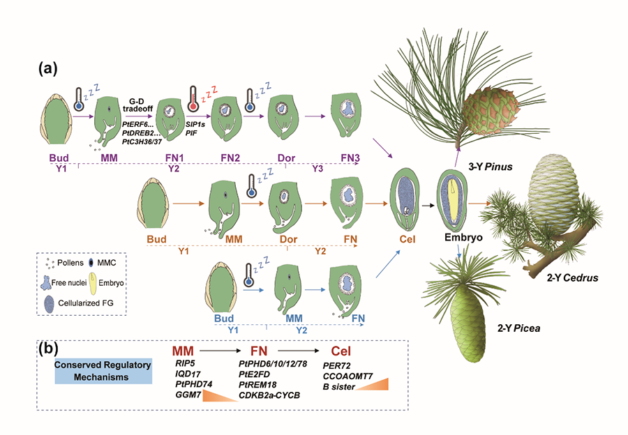 松科是裸子植物中最大的两个科之一,起源于侏罗纪,现存11属约230种植物,广泛分布于北半球。传统概念的松柏类植物包含松科等8个科、约614个物种,不及被子植物(开花植物)物种数的千分之二,但构成了全球39%的森林覆盖,具有极其重要的生态与经济价值。松科在漫长的进化历史中形成了独特、多样的生殖周期,主要分为三种类型:1)松属型,见于松科第一大属——松属及其姐妹类群银杉属,其生殖周期长达三年,从生殖芽分化到球果成熟跨越三个生长季,且授粉与受精相隔约一年;2)云杉属型,包括云杉属、落叶松属、冷杉属等八个属,其生殖周期为二年,生殖芽于第一年形成,授粉与受精均在第二年完成,两者间隔约2至4个月;3)雪松属型,其生殖周期同样为二年,但秋季授粉、次年受精。在这三类生殖周期中,雌配子体发育的时序进程是否一致?其遗传调控机制又是什么?该生殖周期多样性具有怎样的适应意义?特别值得注意的是,松属植物的“球果”普遍存在“夏季休眠”现象—即在生殖周期第二年完成授粉后,未受精的“球果”于夏季进入发育停滞阶段。这一独特现象受何种分子机制调控?