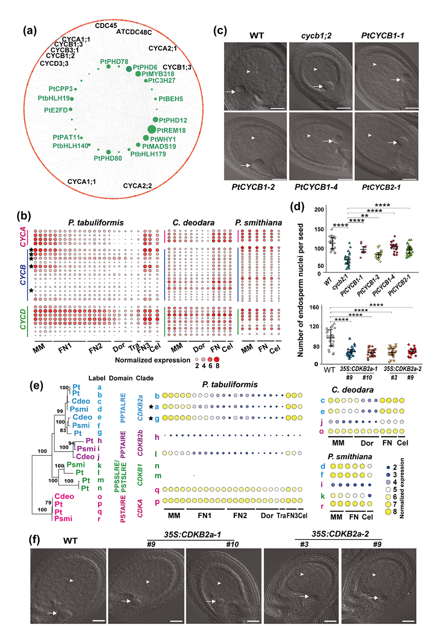 在遗传调控层面,该研究发现松科植物雌配子体发育各阶段具有相对保守的分子调控机制。例如,在游离核活跃分裂阶段,细胞周期蛋白B亚家族及其依赖性激酶B2亚家族成员为核心调控基因,它们在三个物种中均呈现与雌配子体游离核分裂同步的表达模式,且在拟南芥异源转化体系中可引发胚乳游离核数量变化(图2)。又如,在大孢子母细胞阶段,MADS-box基因家族的两个GGM7基因(DAL10/21)参与胚珠早期发育的调控。