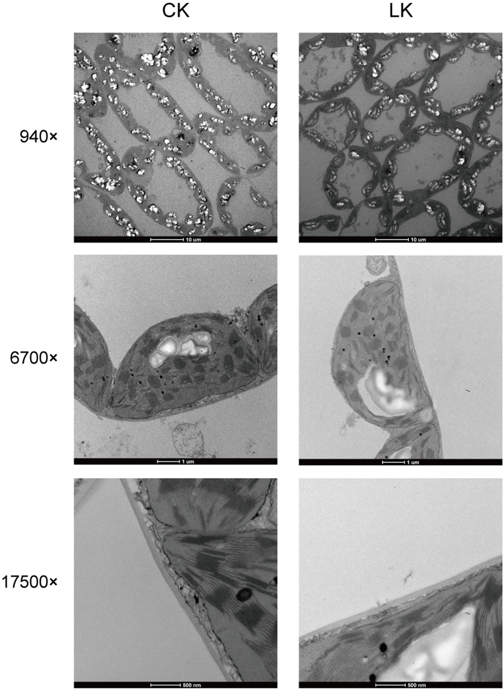 图1研究中番茄对照组和缺钾叶片的叶肉细胞超显微结构图。