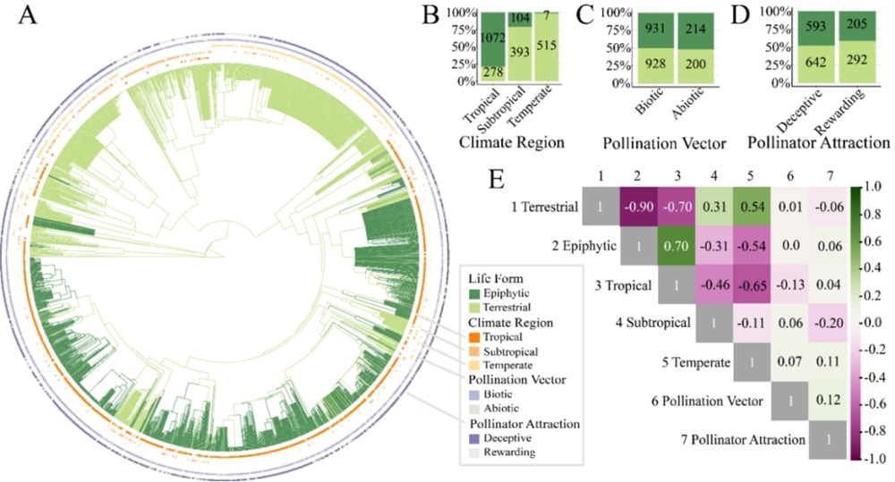 中国科学院西双版纳热带植物园(简称“版纳植物园”)快速进化与保护组与福建农林大学合作,整合了全球2272种兰科植物的性状数据和系统进化树,覆盖兰科全部五个亚科302个属。在同一模型框架下系统量化了气候分布区、传粉媒介、传粉者吸引策略和兰科物种进化历史对生活型演化的相对贡献,同时系统比较了这些兰科性状其自身的进化保守性。