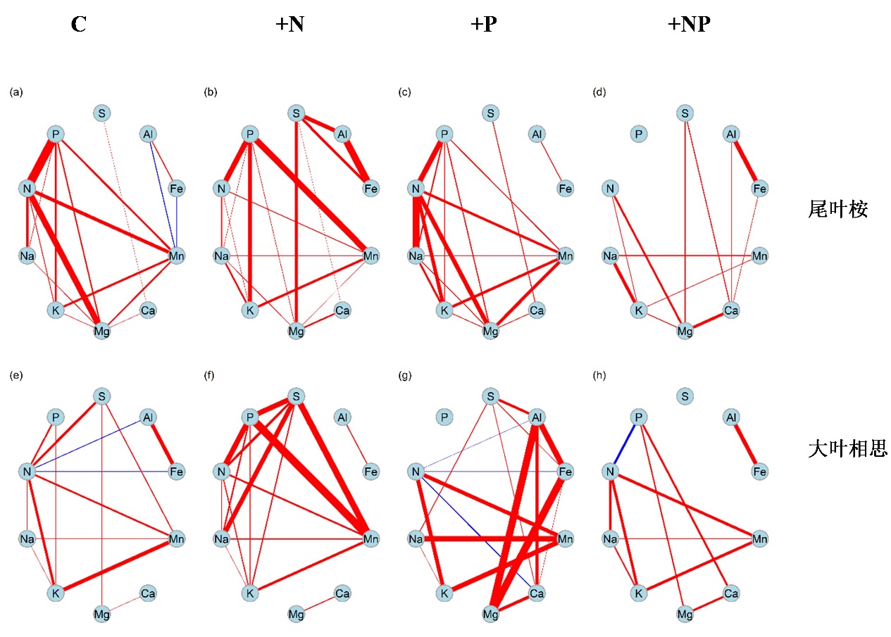 中国科学院华南植物园鼎湖山站研究团队基于广东鹤山长期氮磷添加实验平台,选取我国南方两种典型人工林树种——尾叶桉和大叶相思为研究对象,探讨长达十年的氮磷添加(+N,+P,+NP)对其器官水平元素浓度及其网络关系的影响。结果表明,长期+N下,两种树种均能维持大量元素(N,P,S,K,Na,Ca和Mg)在器官水平的浓度稳定,但微量元素在尾叶桉的根(Al和Fe)和大叶相思的叶片(Fe)中发生显著变化。长期+N和+NP下,两种树种器官水平的P和Na均升高,但K浓度降低,尤其以叶片中的变化最为明显。而且,长期氮磷添加改变了元素间的网络关系(图1):长期+N增强了两种树种中S与其他元素的相互关系;长期+P使大叶相思中P与其他元素解耦;长期+NP则使得尾叶桉中P与其他元素解耦,同时减少两种树种中多种元素之间的网络关联。这些元素相关性的转变预示着可能对生态系统结构与功能产生深远影响。