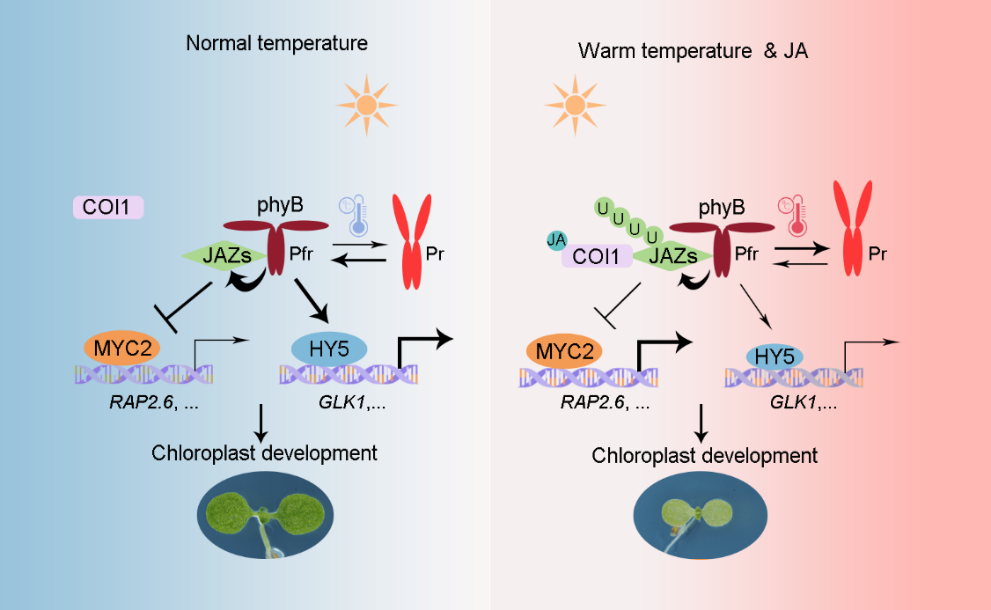 叶绿体作为植物光合作用的核心细胞器,其发育进程受到环境因子与内源激素网络的协同调控。多种植物激素如生长素、细胞分裂素、油菜素甾醇、脱落酸及茉莉酸(JA)等均在叶绿体发生与发育中发挥精细调控作用。尽管光、温等环境信号与茉莉酸介导的激素信号各自调控叶绿体发育的分子机制已有较多研究,但二者如何协同互作、整合信号通路以精准调控叶绿体发育的分子机制,仍是植物发育生物学领域的前沿科学问题。