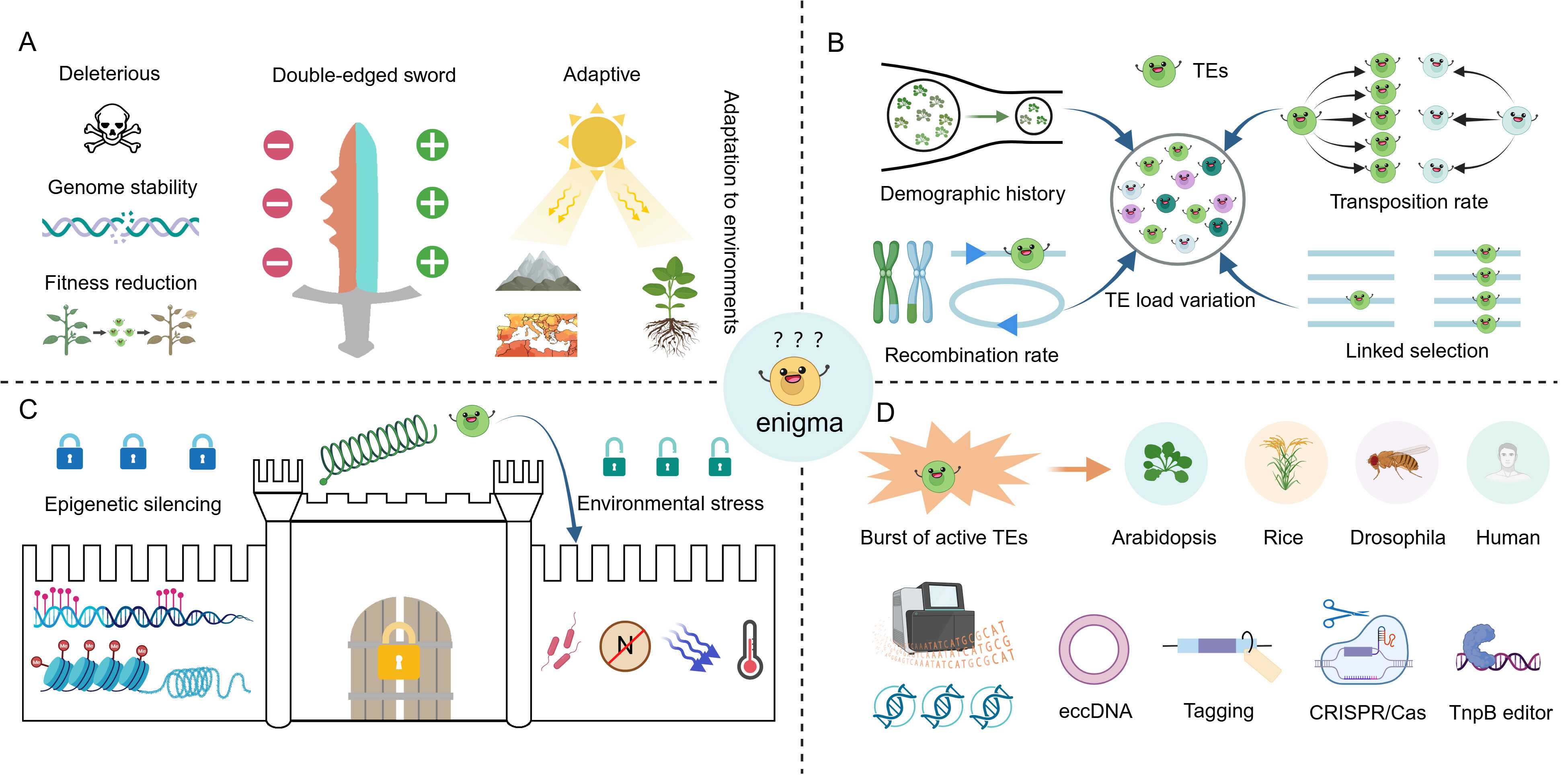 “转座子数量之谜”。A. 转座子的有害性和有益性;B. 决定转座子最终命运的群体过程;C. 转座子转座的调控因素;D. 活跃性转座子的表征、鉴定方法以及应用。