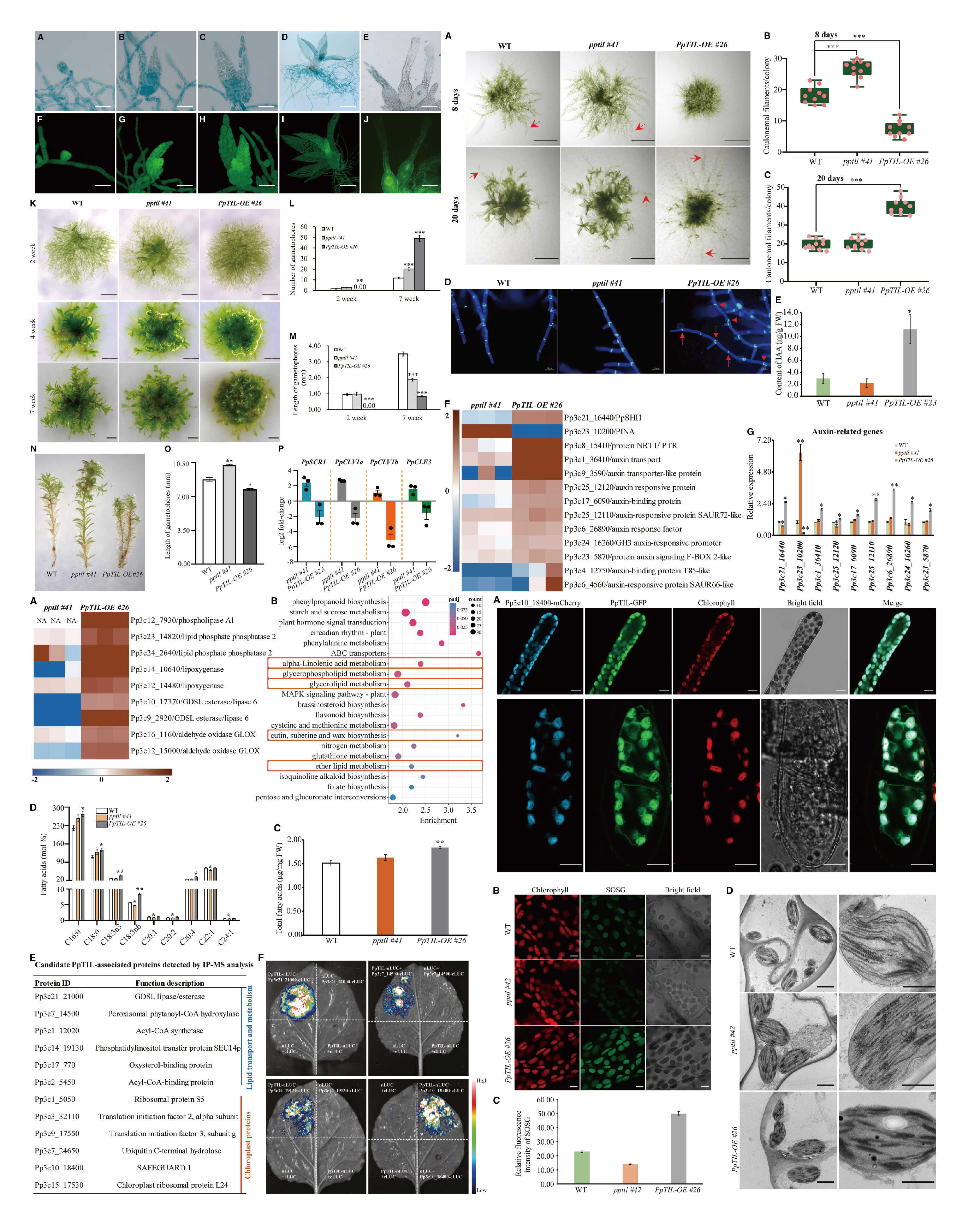 图2PpTIL参与调控二维生长向三维生长转变、茎叶体发育、脂质代谢和¹O₂胁迫