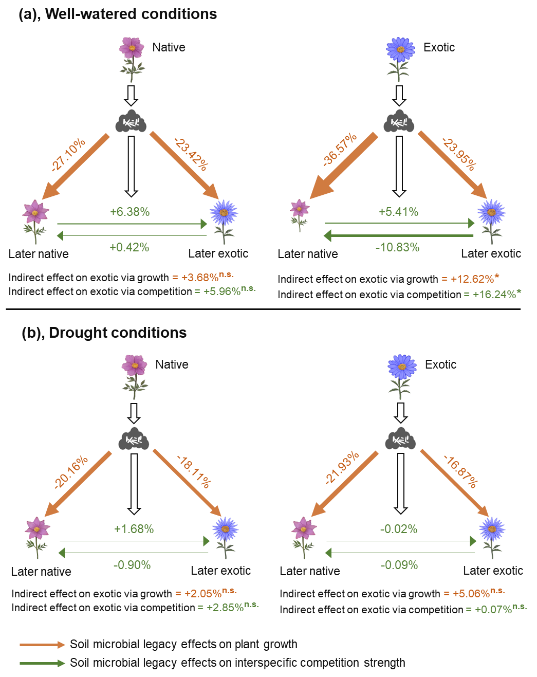 图1. 在不同水分条件下,本地植物和入侵植物形成的土壤微生物遗留效应对后续本地植物和入侵植物互作关系的影响。