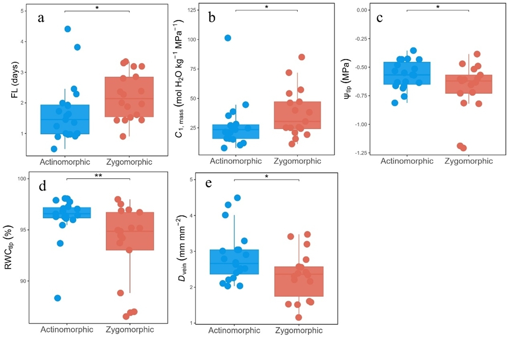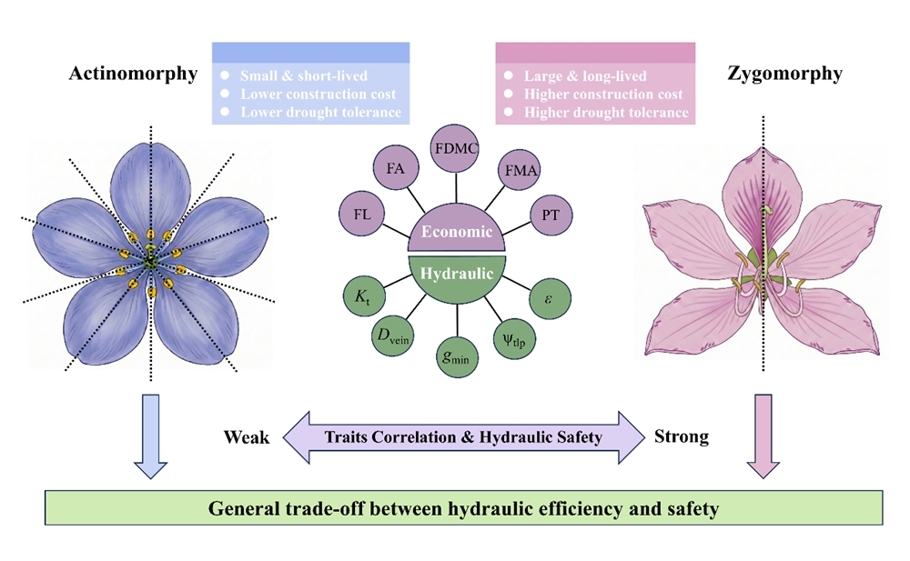 花的对称性是被子植物多样化和生态适应的关键驱动力。长期以来,研究多聚焦于花对称性与传粉者协同进化的形态学关联。然而,为了维持花朵在开放期间的形态稳定和繁殖功能,不同对称形式的花在水分运输、水分储存以及抗旱策略等生理维度上是否存在差异一直尚未明确。阐明花对称性与水力策略之间的内在关联,对于更全面地理解被子植物的演化及环境适应机制具有重要意义。
