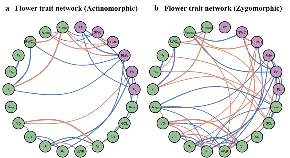 研究发现,两侧对称花采取了更为保守和安全的水力策略。与辐射对称花相比,两侧对称花具有更长的花寿命和更低的花脉密度。除此之外,它们还表现出更负的膨压丧失点水势、更低的膨压丧失点相对含水量以及更高的水容。值得注意的是,在控制了物种原生地的气候变量影响后,花寿命、膨压丧失点水势和花脉密度的差异依然显著。这一结果表明,这些核心性状是受花对称性结构驱动的“内在特征”;而水容和膨压丧失点相对含水量则体现了植物对外部环境水分条件的“可塑性响应”。在整体功能策略上,辐射对称花更倾向于优先保证水分供应能力来维持花的开放,而两侧对称花不仅将更强的水力安全性与更长的寿命相结合,还在水力、结构和繁殖性状之间表现出更强的协同作用,形成了高度整合的功能模块,有助于它们在波动的环境条件下维持更高的水力稳定性。