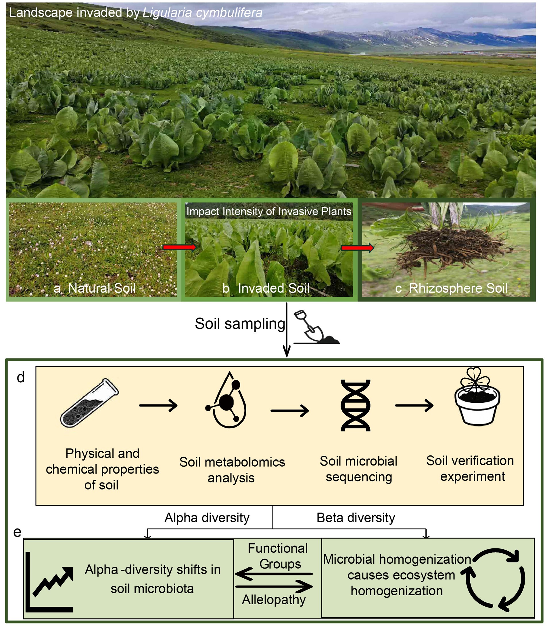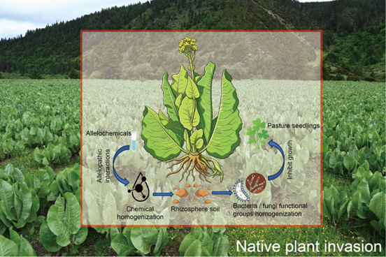 这类“本土入侵植物(Native Invasive Plant)”不同于传统的跨界入侵者。它们没有偷渡入境,却在自己的家乡表现出极强的扩张性。已有研究表明,舟叶橐吾能通过根系分泌化感物质(如对羟基苯甲酸PHBA),直接抑制其他植物的生长。然而,以往研究多集中于地上植物竞争,对于这些化感物质如何改变土壤环境进而重塑地下微生物群落,以及这种改变是否会反过来影响牧草生长,认识十分有限。