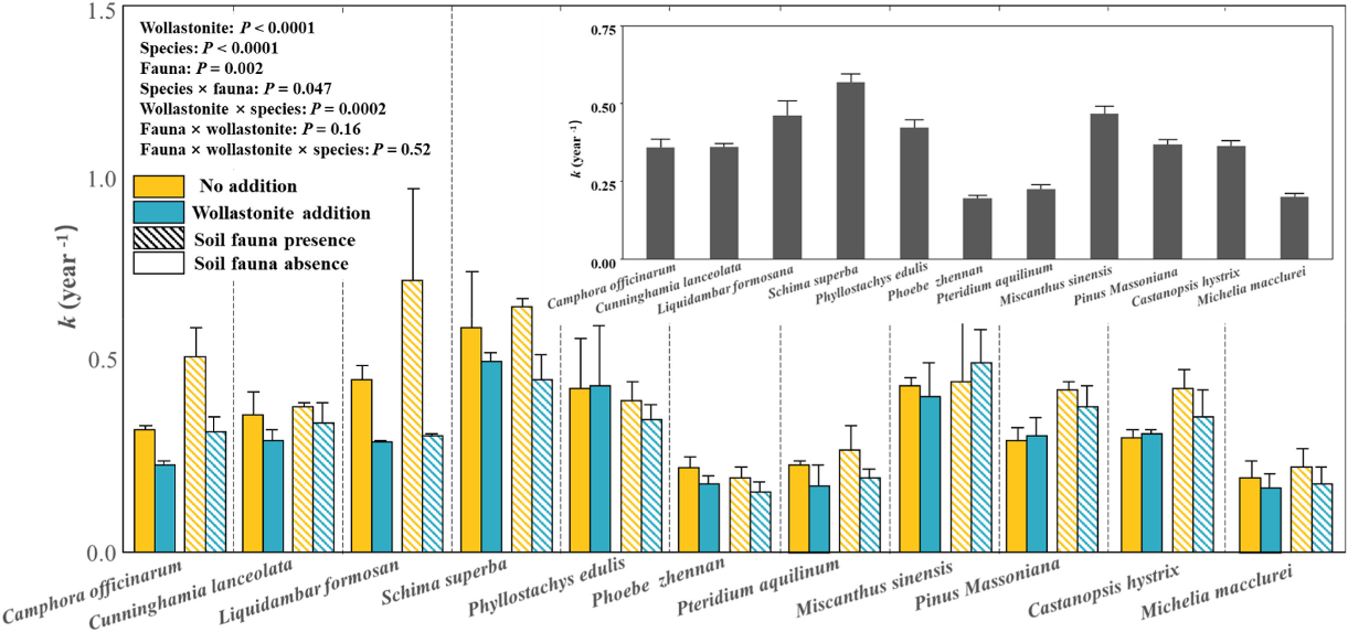 图1硅灰石添加对亚热带森林11种凋落物分解速率的影响