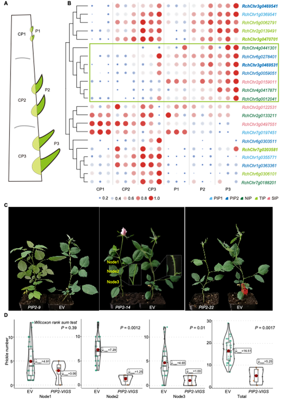 结合前期QTL定位结果,研究团队发现位于月季第3号染色体QTL1区段的 RcPIP2;1(即 RchChr3g0469531)在皮刺中特异性高表达,且随皮刺成熟表达量上升(图2)。利用病毒诱导的基因沉默(VIGS)技术,在带刺月季品种‘Samantha’中抑制该基因表达后,沉默植株茎干第2和第3节位的皮刺数量显著减少(Wilcoxon检验,P = 0.0012 和 P = 0.01),而空载体对照组无此变化。沉默并未影响植株整体生长和开花,表明 PIP2;1 对皮刺发育具有相对特异的调控作用。一个古老的水通道蛋白家族成员,在蔷薇科中经过正选择后,参与调控皮刺这一测生器官的发育。