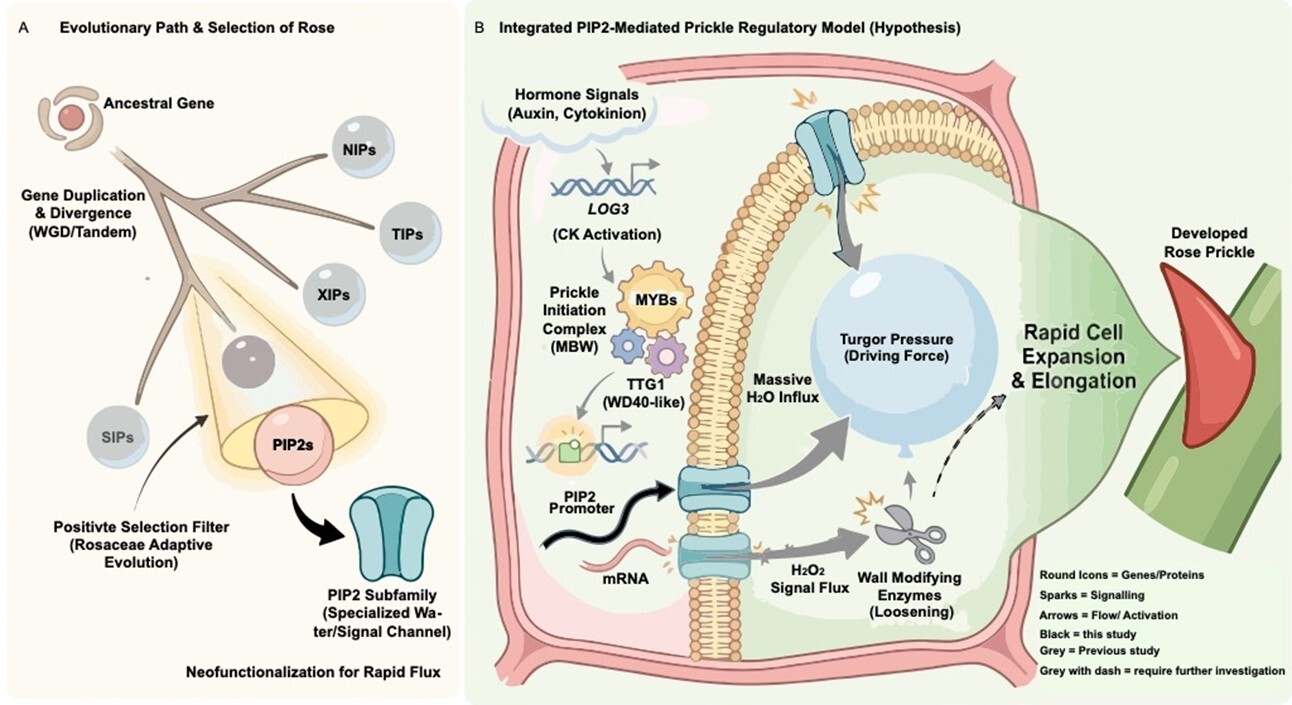 月季以其绝美的花型和芬芳闻名于世,但茎干上密布的皮刺却给田间管理、采收和切花品质寿命带来不利影响。传统观念认为,皮刺是植物抵御草食动物和机械损伤的防御结构。然而,2021年发表于National Science Review的研究(Zhong et al., NSR, 2021;)首次揭示了一个反直觉的现象:月季皮刺在发育早期具有较高的相对含水量,显著高于其它组织,提示皮刺可能兼具“水分储存库”的功能。该研究还在皮刺相关的QTL区间内发现了两个水通道蛋白基因(PIP2s),其表达在无刺品种与有刺品种之间存在显著差异。在此基础上,中国科学院昆明植物研究所胡金勇团队与山东农业大学联合攻关,在Horticulture Research发表最新成果(Zeng et al., HR, 2026;),对植物界水通道蛋白进行了系统进化分析,并以蔷薇科为模型,证实PIP2亚家族受到强烈正选择,且沉默其中关键成员 RcPIP2;1 可显著减少月季茎干皮刺数量。这一发现为培育“无刺月季”提供了全新的分子育种靶点,也为理解植物如何协调水分利用与形态创新打开了新视角。