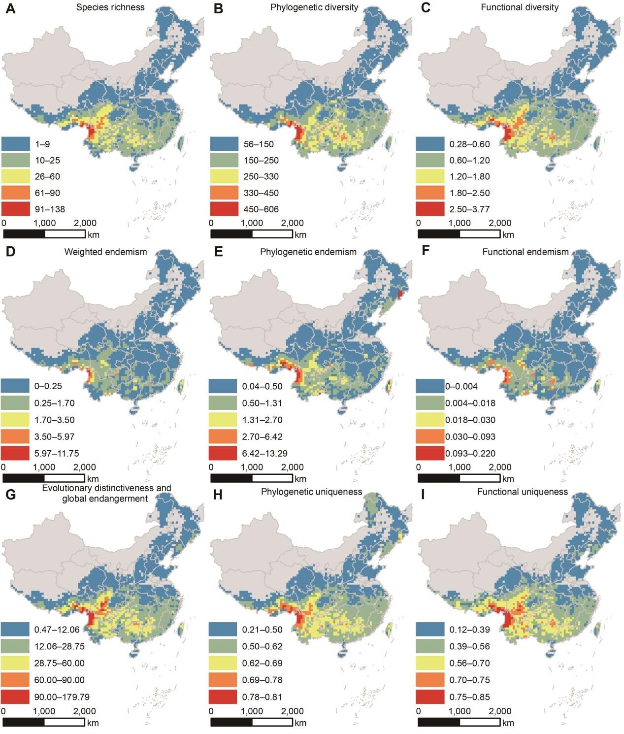 图2 中国杜鹃花属独特性–距离模型的空间格局