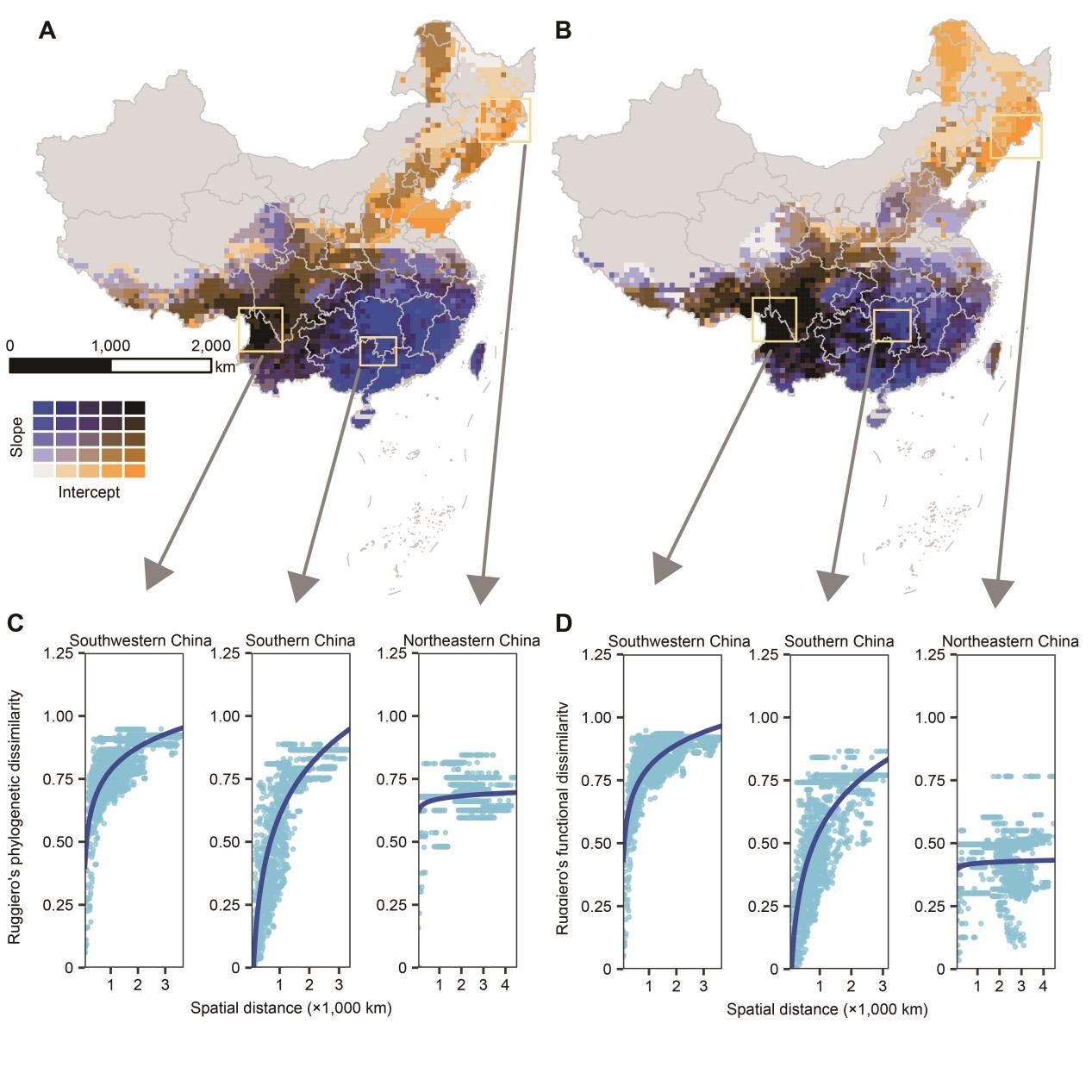 杜鹃花属独特性的形成机制在不同地区存在明显差异:在中国西南地区,高独特性主要归因于中等和年轻的独特谱系积累,以及群落的快速分化;在中国南方地区,则主要与随空间距离增加而加剧的群落组成差异有关;而在中国东北地区,则主要源于古老谱系的保存(图2)。