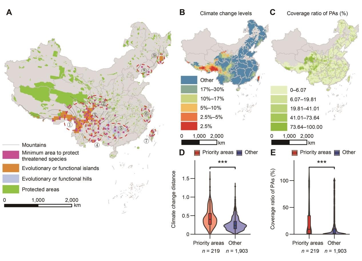 基于上述结果,研究识别了中国西南、华南和东北山地的9个优先保护单元,并发现随着保护目标由10%提升至30%,保护空缺进一步扩大(图3)。该研究为将多维多样性指标纳入山地植物保护实践提供了新思路,也为理解山地植物多样性的维持机制提供了科学依据。