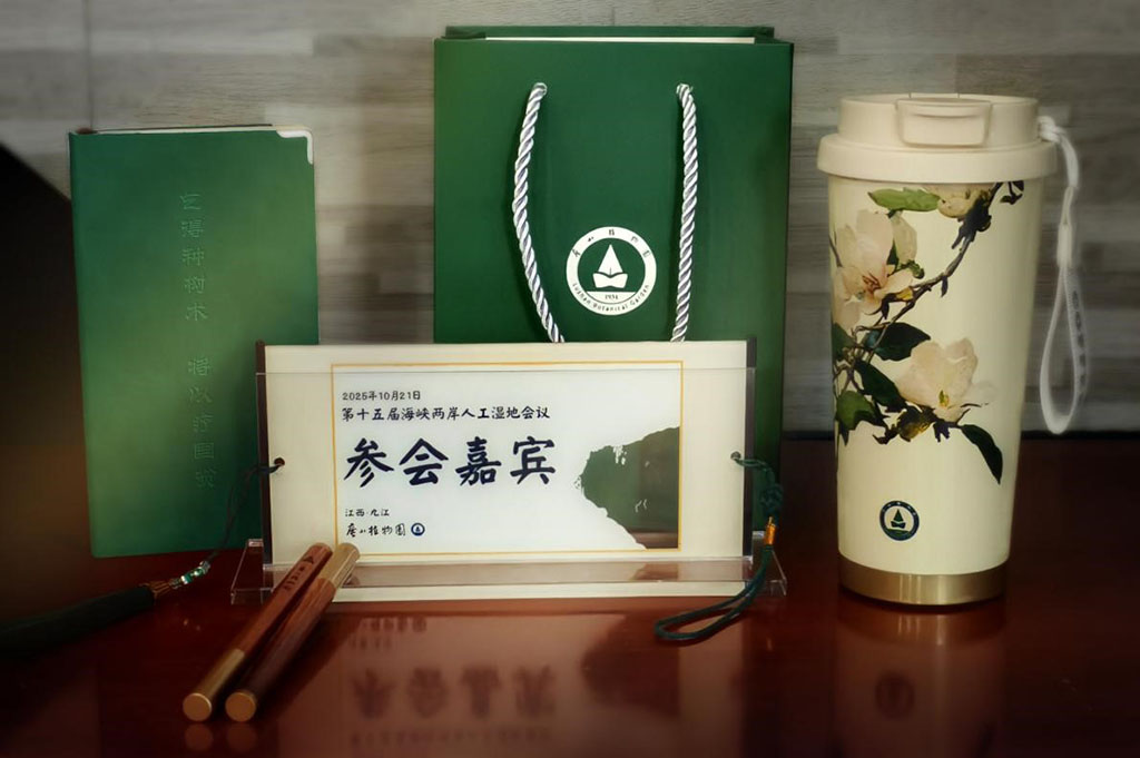 此外,庐山植物园精心设计了一套具有收藏价值与实用功能的纪念品,包括席位牌、记录本、签字笔与水杯:席位牌正面印有专家姓名,背面饰以植物当归横切面图案,形态似庐山三叠泉,并题有“根脉连枝血同源,山河未圆且当归”,寓意两岸同根同源、共盼团圆,同时可作挂件使用;记录本扉页刊印庐山植物园简介,并围绕园训“乞得种树术,将以疗国贫”撰写纪念文字,彰显植物园的使命与担当;水杯绘有庐山植物园特色植物图案,美观实用。