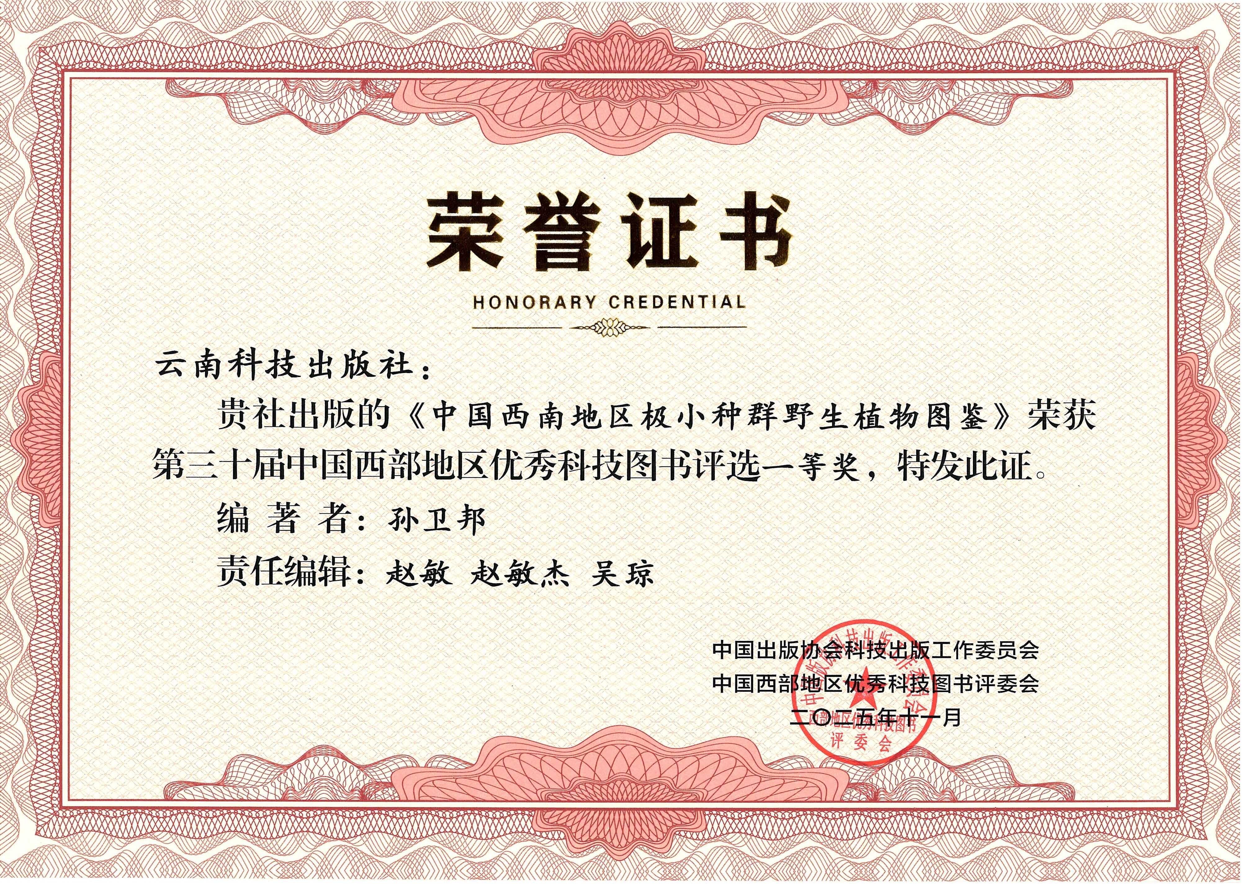 近日,《中国西南地区极小种群野生植物图鉴》荣获第三十届中国西部地区优秀科技图书评选一等奖。该书由中国科学院院士许智宏作序,中国科学院昆明植物研究所孙卫邦研究员主编,刀志灵、高信芬、李捷和杨湘云为副主编,31人参编,88人提供图片。